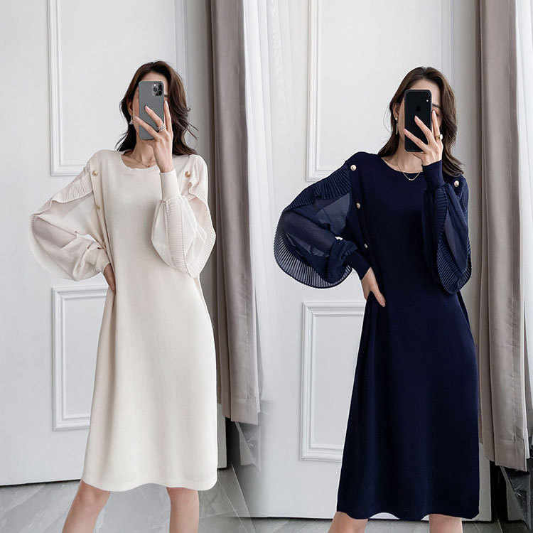 ワンピース 長袖 春秋 シフォン きれいめ レディース お出かけ ライン 膝丈 フェミニン パーティドレス お洒落 女の子 優雅 着やせ 同窓会 結婚式 普段着 ゆったり 体型カバー -1007