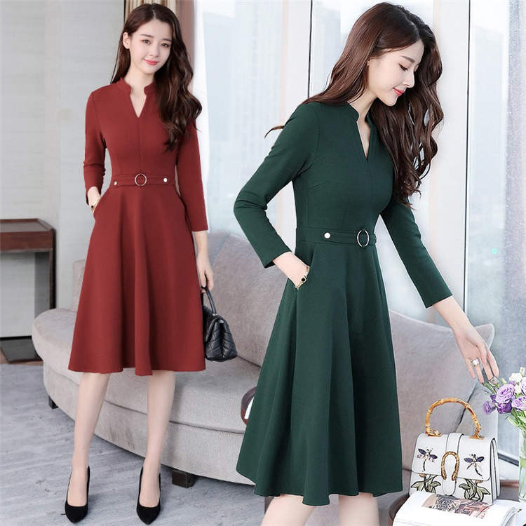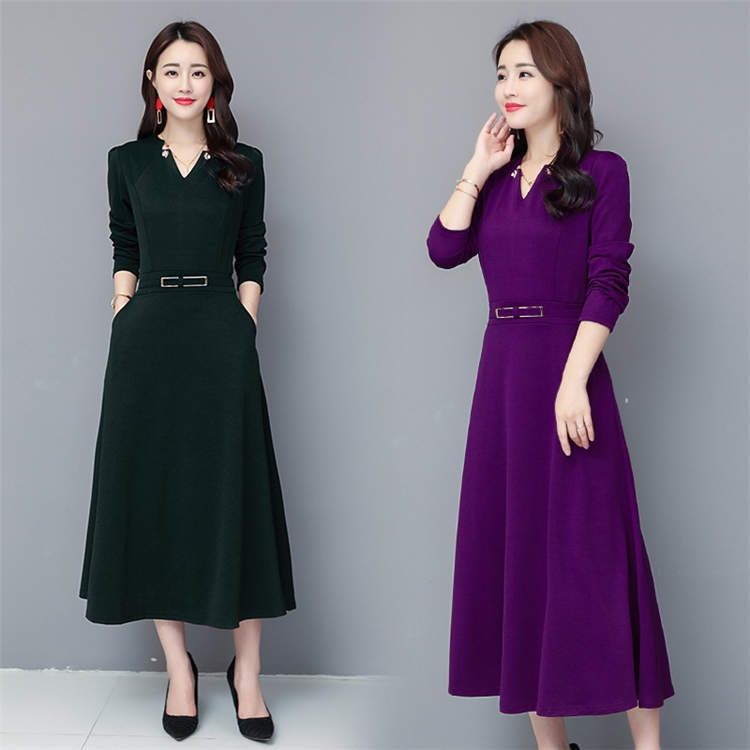 ワンピース Aライン レディース 春 秋 大人 上品 ミディアム 無地 パーティー きれいめ ゆったり エレガント 長袖 オフィス Vネック