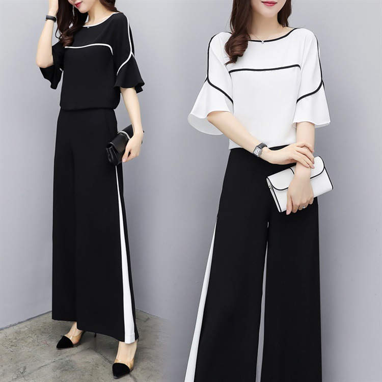 セットアップ 2点セット 上下セット ワイドパンツ 体型カバー トップス パンツ 七分袖 脚長効果 ホワイト ブラック 披露宴