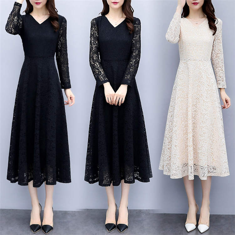 レース Vネック ワンピース レディース マキシ丈 ロングワンピース ドレス 結婚式 お出かけ カジュアル 春 秋 長袖 エレガント
