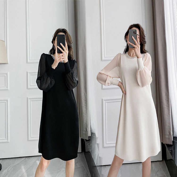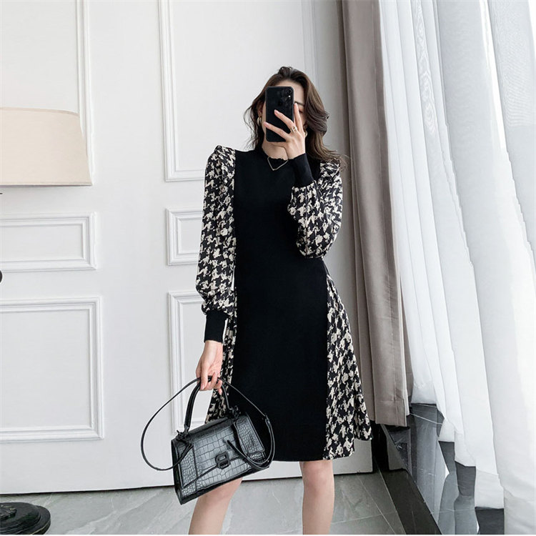 ワンピース 長袖 春秋 ニットきれいめ レディース フェミニン パーティドレス お洒落 女の子 優雅 大人切り替え デート 着やせ 膝丈 格子スリーブ お出かけ Aライン L-1002