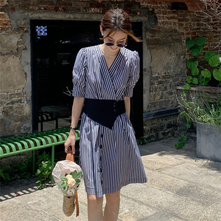 ワンピース 五分袖 春秋 きれいめ レディース お出かけ ライン シャツワンピ 膝上 フェミニン パーティドレス お洒落 女の子 大人 デート 着やせ 結婚式 同窓会 ストライプ 体型カバー -9