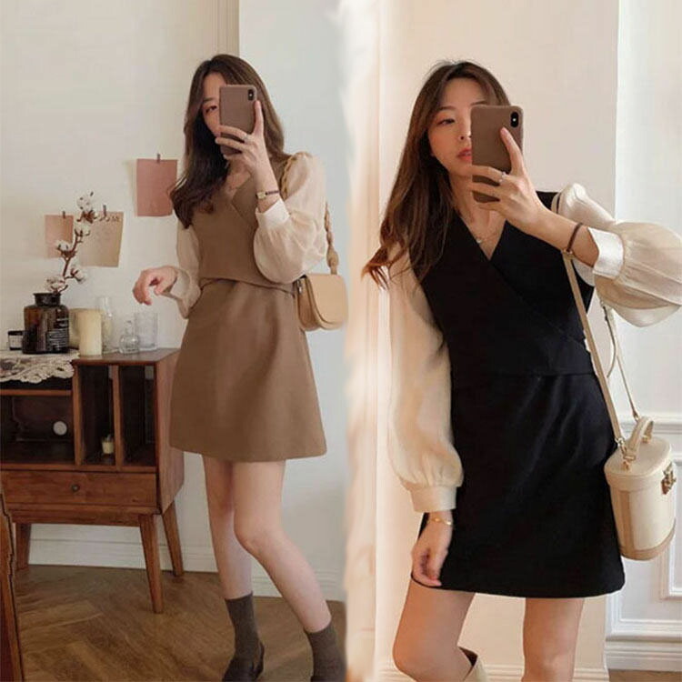 ワンピース 長袖 春秋 きれいめ レディース お洒落 女の子 優雅 大人切り替え デート 着やせ ミモレ丈 バイカラー 同窓会 お出かけ Aライン フェミニン 体型カバー lianyiqun-1014