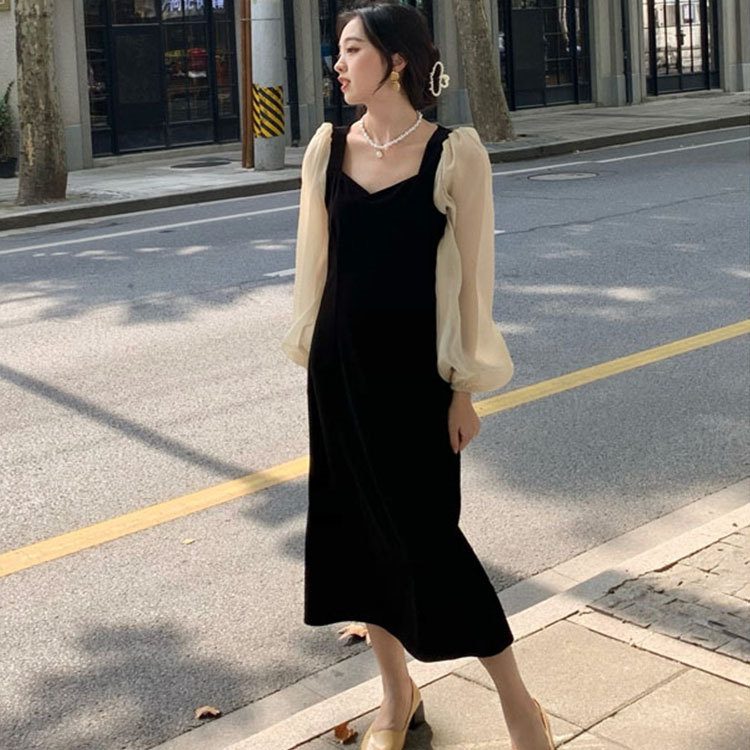 ワンピース 春秋 長袖 ベージュ ブラック Aライン きれいめ お出かけ 結婚式 同窓会 体型カバー ミモレ丈 上品 大人 おしゃれ ファッション レディース lianyiqun-572