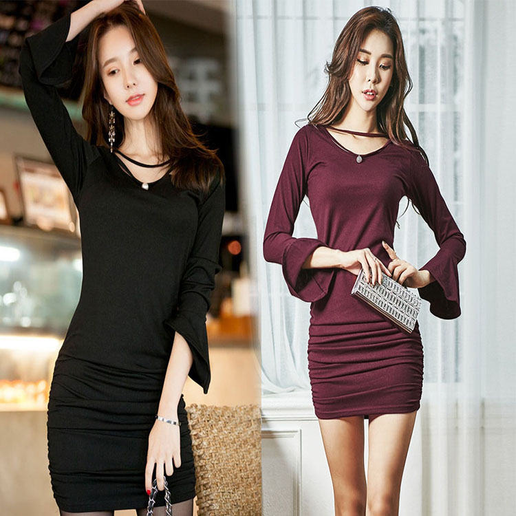 ワンピース 春 秋 長袖 大人 無地 タイト ショート丈 パーティドレス クラブ レディース お出かけ セクシー 結婚式 フェミニン お洒落 女の子 ブラック ワインレッド きれいめ 優雅