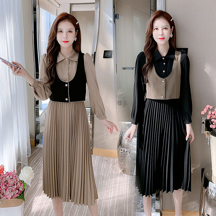ワンピース ベスト セットアップ 長袖 春秋 お出かけ Aライン ミモレ丈 フェミニン お洒落 女の子 体型カバー 着やせ 結婚式 同窓会パーティー プリーツスカート きれいめ lianyiqun-1