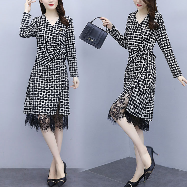 ワンピース 長袖 春秋 チェック きれいめ レディース フェミニン お洒落 女の子 優雅 大人切り替え 体型カバー 大人 着やせ 結婚式 お出かけ ライン ミモレ丈 同窓会 格子 レース パーティー