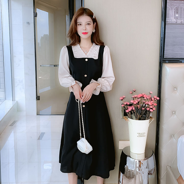 ワンピース 長袖 春秋 バイカラー きれいめ レディース ミモレ丈 フェミニン パーティドレス お洒落 女の子 体型カバー お出かけ Aライン 大人 デート 着やせ 結婚式 同窓会 lianyiqun