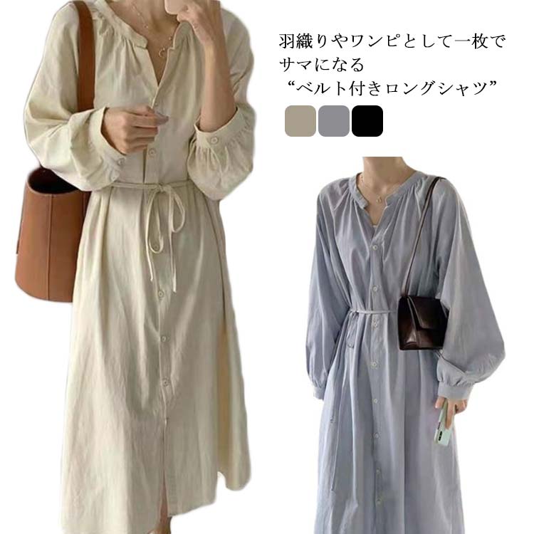 シャツワンピース 秋 長袖 ネック春 夏 秋 ミモレ丈 ロング丈 マキシ丈 無地 リボン付き ラインロングワンピース 韓国風 ゆったり 綿 コットン 通勤 デート 女子会 旅行