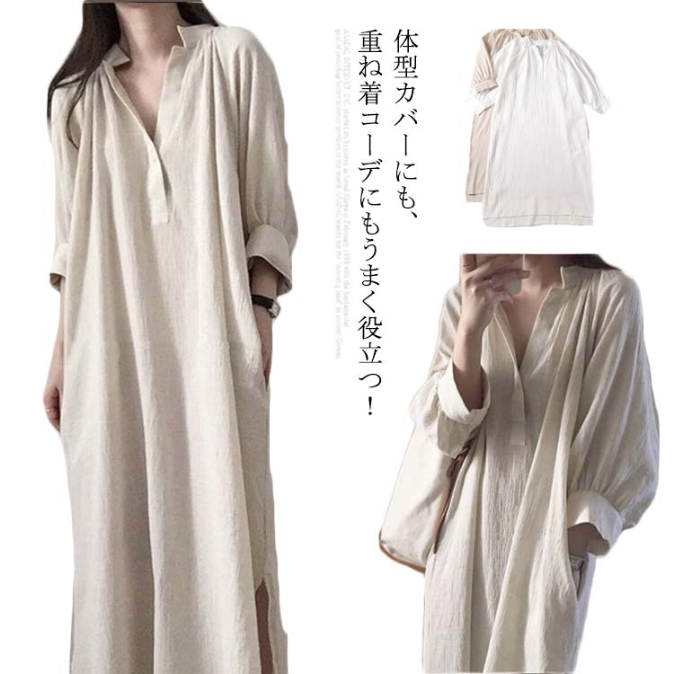 ワンピース レディース シャツワンピース ゆったり コットン 通勤 秋 五分袖 綿 麻 ネック 麻風 ロングワンピース デート 女子会 旅行 お出かけ カジュアル ナチュラル
