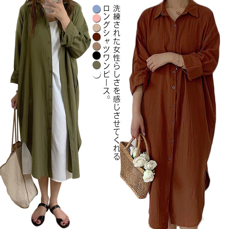 シャツワンピース チュニック 2Way レディース ロングシャツ ラ 重ね着 キレイめ カジュアル シンプル 体型カバー 韓国風 イトアウター 羽織り