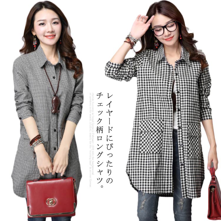 ロングシャツ チュニック トップス チェック ギンガムチェック 大きサイズ 体型カバー 春 秋 大人 カジュアル ポケット付き チェック柄