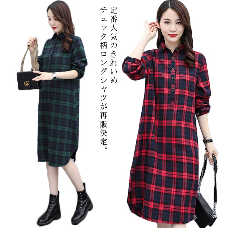 着丈の長さがポイント チェック柄シャツワンピース チェック柄シャツ カジュアルワンピース 膝下丈 ロングシャツワンピ ゆるカジ 長袖 シャツワンピース チェック