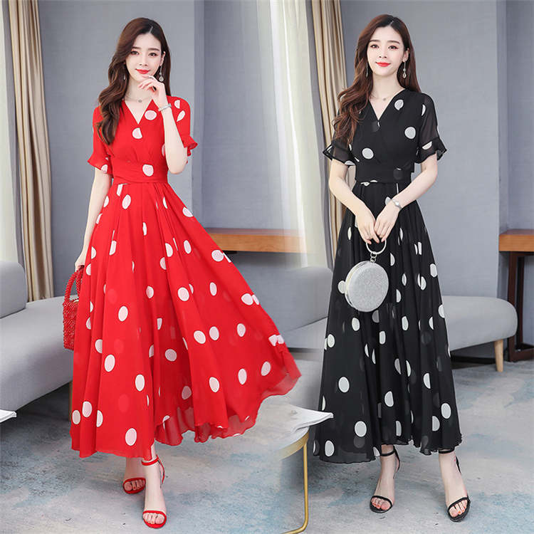 ドット 水玉 ワンピース Aライン レデイース Vネック 夏 半袖 マキシスカート ロングワンピレディースファッション ワンピース