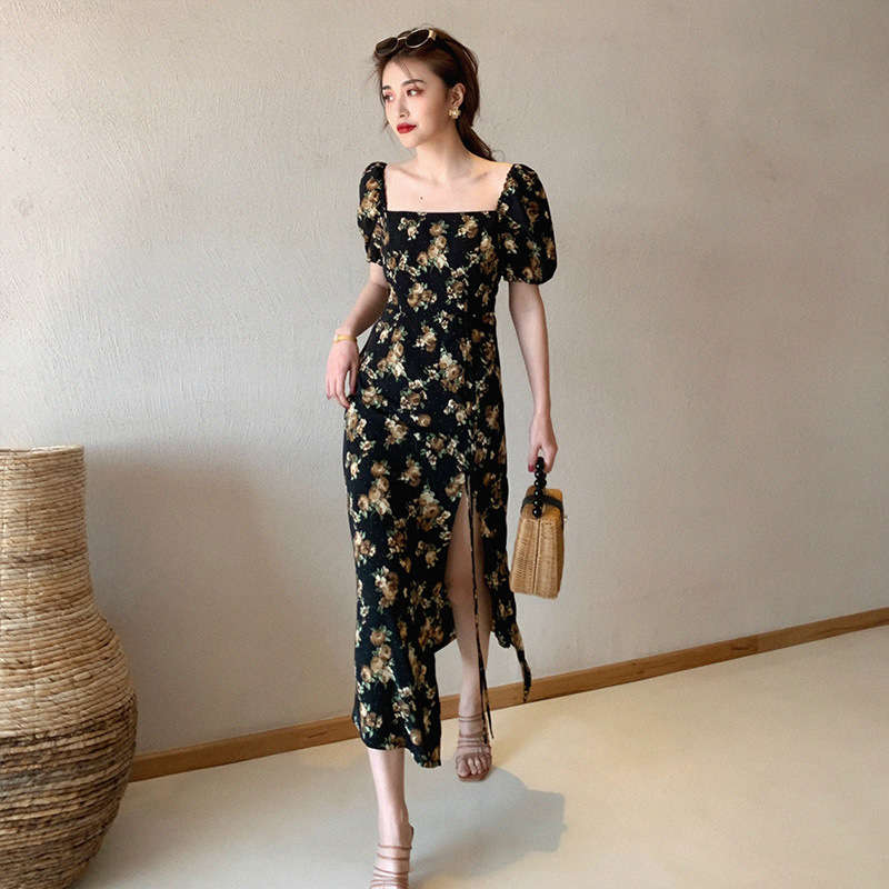 スクエアネック タイトワンピ 半袖 ワンピース 花柄 シフォン ミモレ丈 リゾートワンピ 旅行 海 S M L ブラック レッド パフスリーブ lianyiqun-437