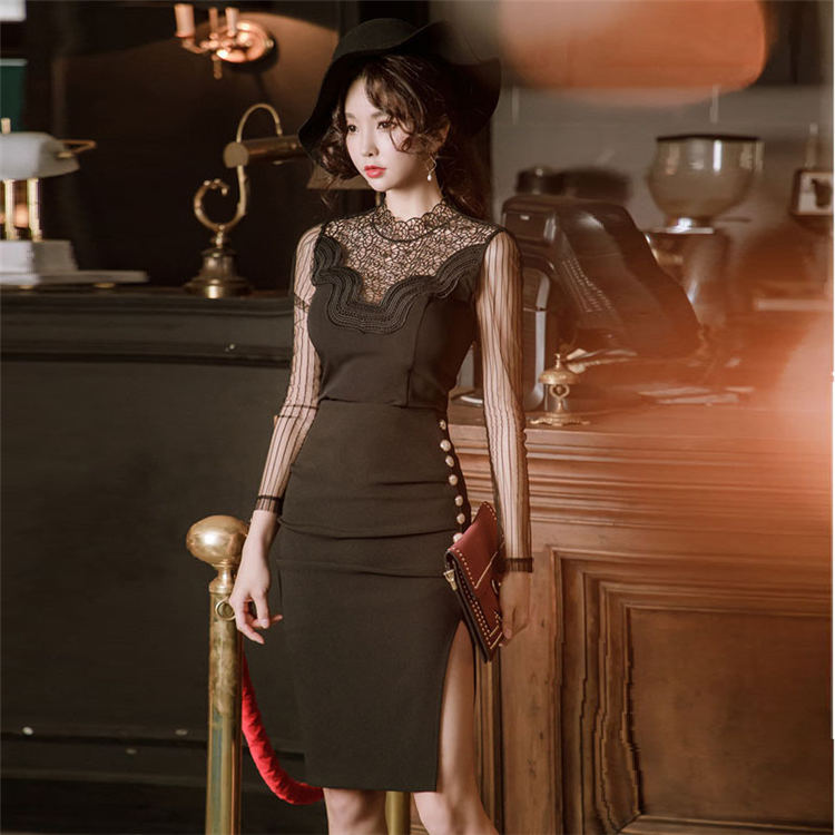ワンピース 長袖 透け感 大人 蝶結び 上品タイト ブラック 女の子 優雅 レディース お出かけ セクシー フェミニン レース きれいめ クラブ お洒落 大人切り替え お呼ばれ xinggan-473