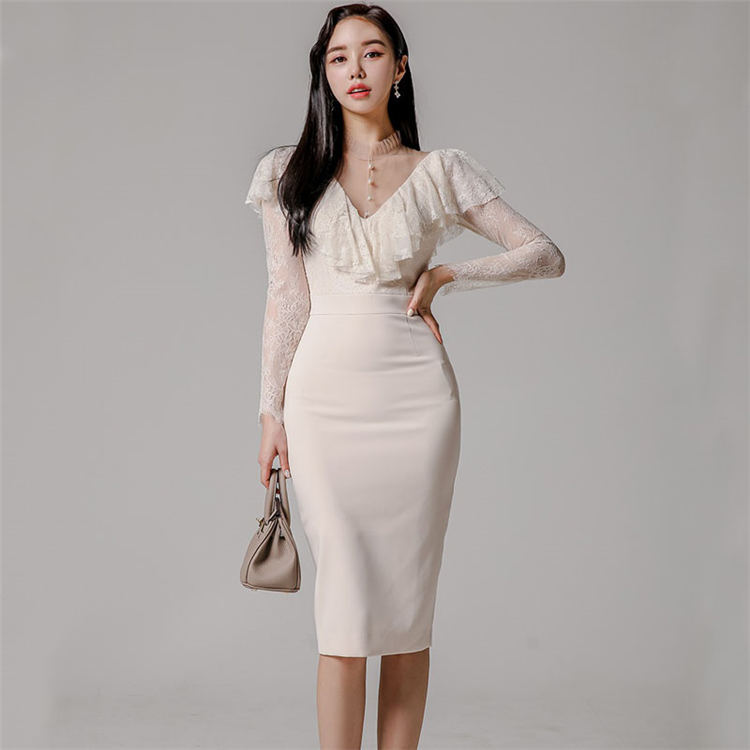 ワンピース 春 長袖 Vネック フリル 膝丈 タイト きれいめ クラブ レディース お出かけ セクシー フェミニン 大人 上品 レース エレガント パーティドレス お洒落 女の子 お呼ばれ xingg