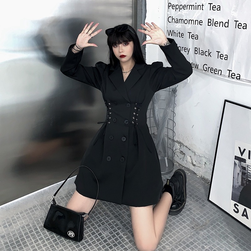 ワンピ 長袖 フリル 切り替え スリム 無地 ダブルブレスト 大きいサイズあり 原宿系ファッション 韓国風 ダンス衣装 カワ 個性 奇抜 かわいい 青文字系 ワンピース チュニック レディース