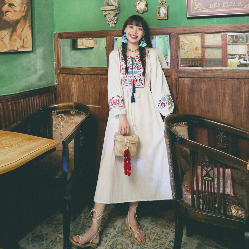 秋 レディース エスニック 刺繍 ワンピース 長袖 ロング 体型カバー ゆったり ネック ボヘミアンワンピース かわいい カジュアル ボヘミアン ミモレ丈 フリーサイズ 30代 40代 50代