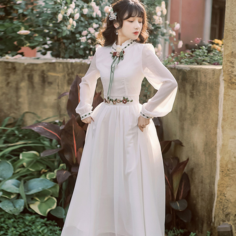 夏 秋 レトロワンピース レディース ワンピース レトロ調 ウエスト花刺繍 フリルカラー ロング丈 長袖 ホワイト イエロー S M L XL クラシック クラシカル きれいめ 上品 大人かわいい 刺