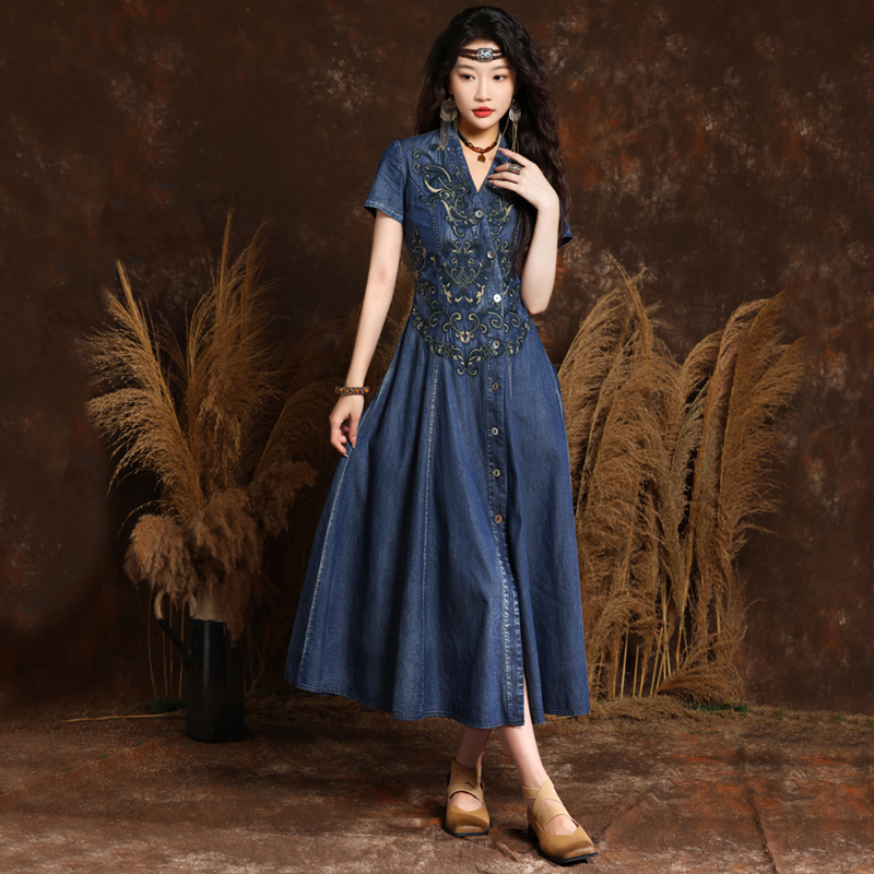大人かわいい アジアン エスニック 刺繍 ロング デニム ワンピ Vネック ロータス フレア スカート ロング 半袖 前後タック入り ウエストほっそり スタイルアップ クールビューティー