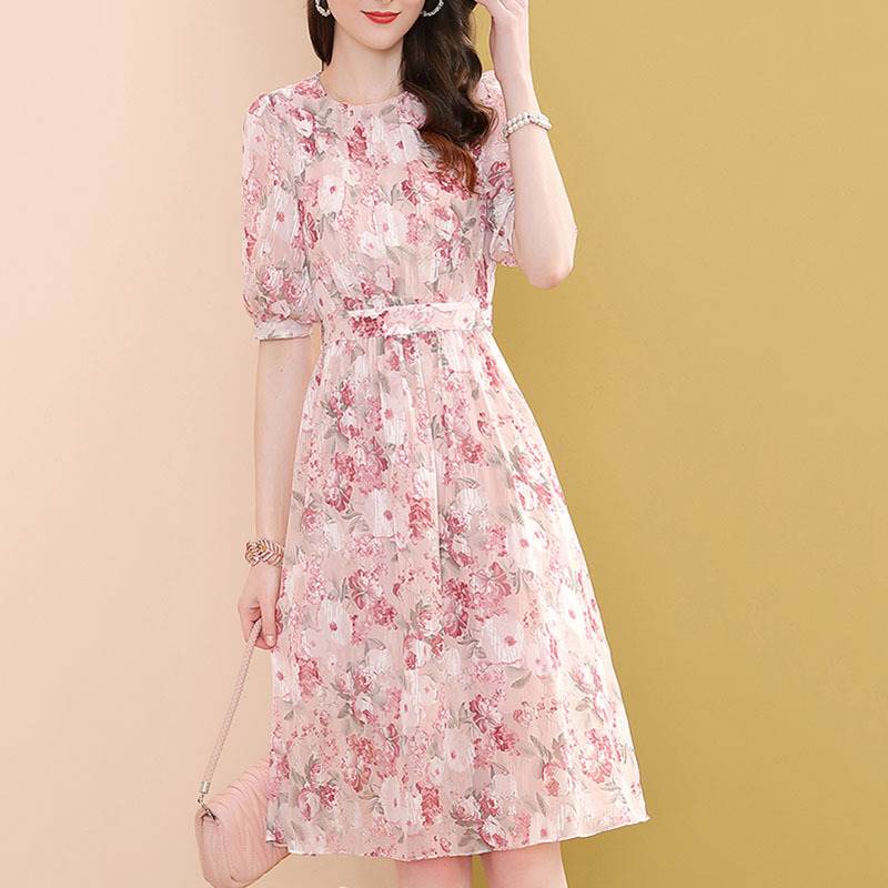 ワンピース レディース 花柄 フラワー きれいめ かわいい おしゃれ 膝丈 エレガント 顔合わせ 細見え 産後 Aライン 発表会 ふわふわ フォーマル ミドル丈 半袖 クルーネック