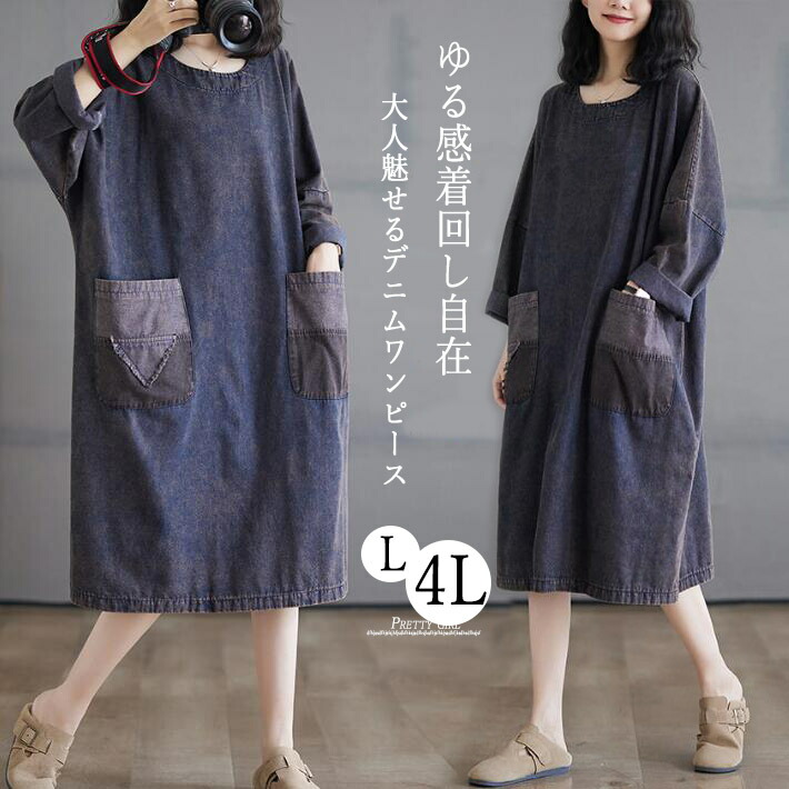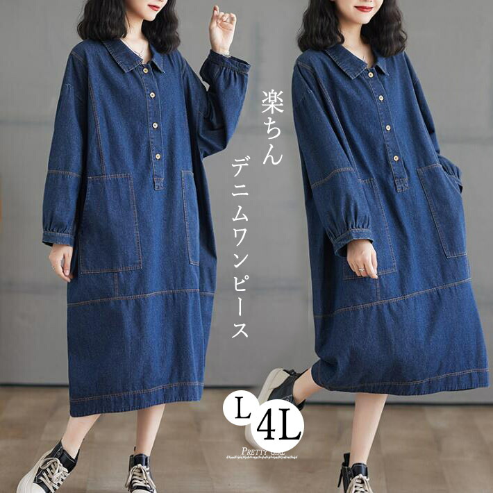 デニムワンピースレディース カジュアルミモレ丈ロング長袖大きいサイズワンピAラインデニム体型カバー ゆったり楽ちん可愛い おしゃれ春秋L2L3L4L