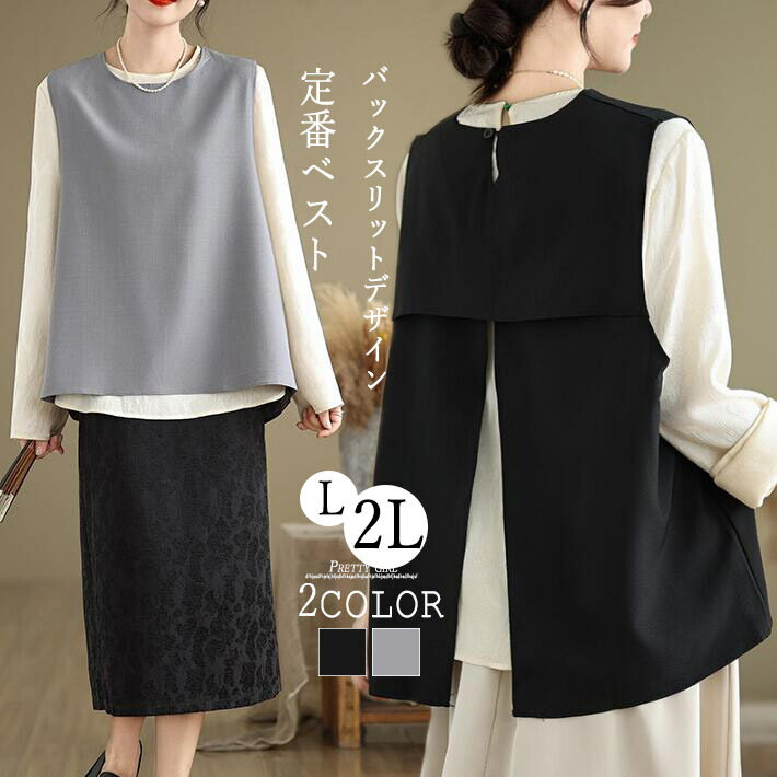 ベストレディース春 夏 秋 ノースリーブ ノースリ 重ね着ミディアムコーデ ジレ ビッグおしゃれ お洒落 袖なし大きサイズ体型カバーL2L