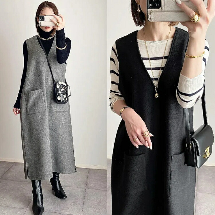 ロング ノースリーブ ワンピース レディース 秋冬 厚め 暖かい Vネック 深い きれいめ エレガント オフィス 重ね着 シンプル 通勤 ゆるい カジュアル ゆったり 楽 ポケット付き 20代 30代