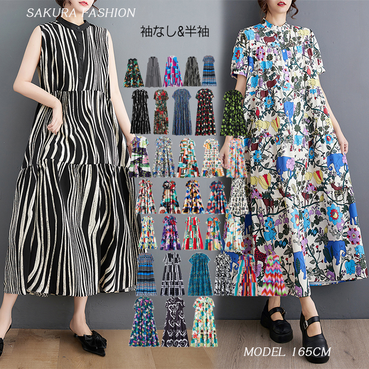 40代 50代 60代 柄ワンピ 柄ワンピース 個性派 個性的 ノーカラー ロング丈 ノースリーブ 袖なし ハーフボタン