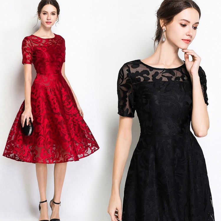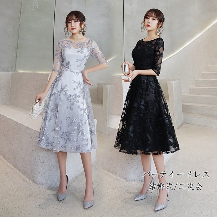 ワンピース レディース パーティードレス レース シンプル 刺繍 ミモレ丈 柄付き お見合い ワインレッド ブラック ネイビー 半袖 膝丈 夏 秋 エレガント結婚式 ドレス
