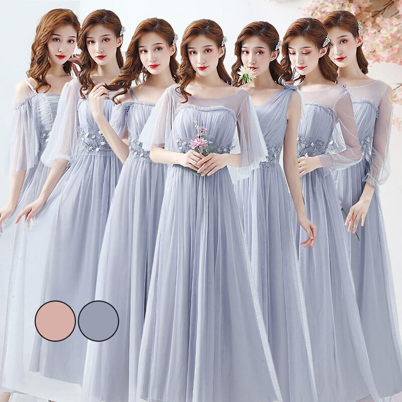 ロングドレス ブライズメイド ドレス ピンク グレー フリーサイズ ひざ下丈ドレスミディアム丈ドレス ひざ下丈