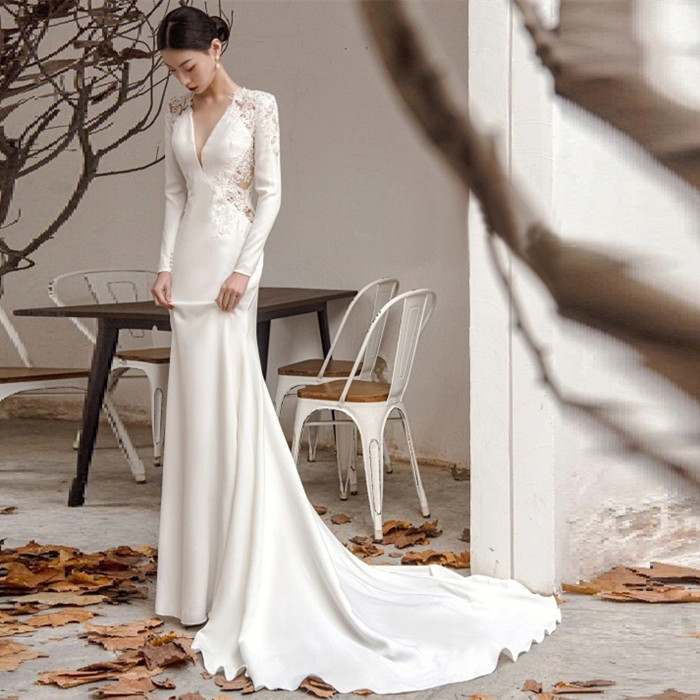 ウエディングドレス 長袖 二次会 マーメイドライン サイズオーダー可能 海外挙式 前撮り 花嫁二次会 大きいサイズ 結婚式 披露宴 パーティードレス トレーン