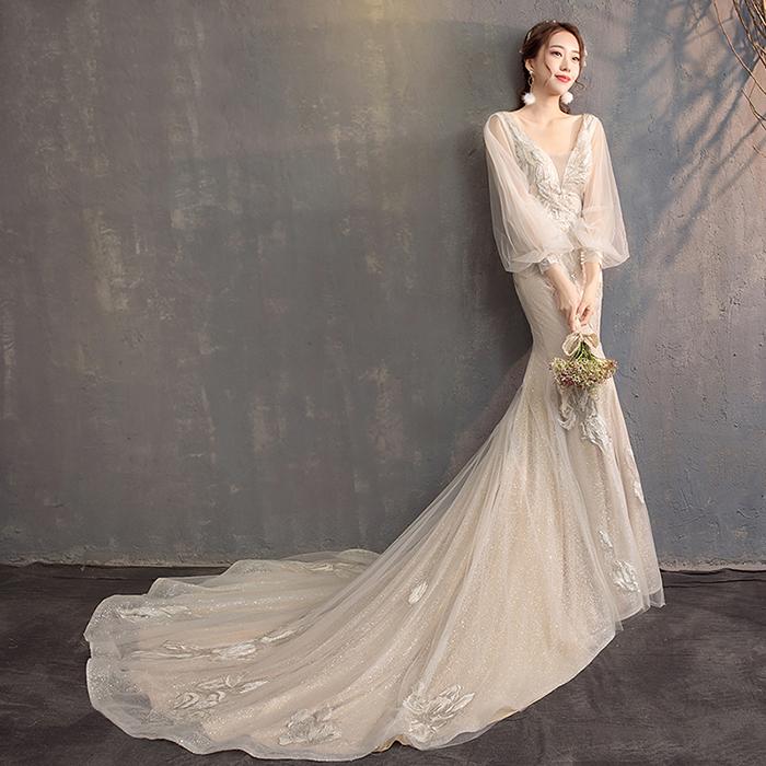 ウエディングドレス 長袖 二次会 ウェディグドレス ラインドレス マーメイドラインドレス 海外挙式 前撮り 花嫁二次会 大きいサイズ 結婚式 披露宴 パーティードレス トレーン