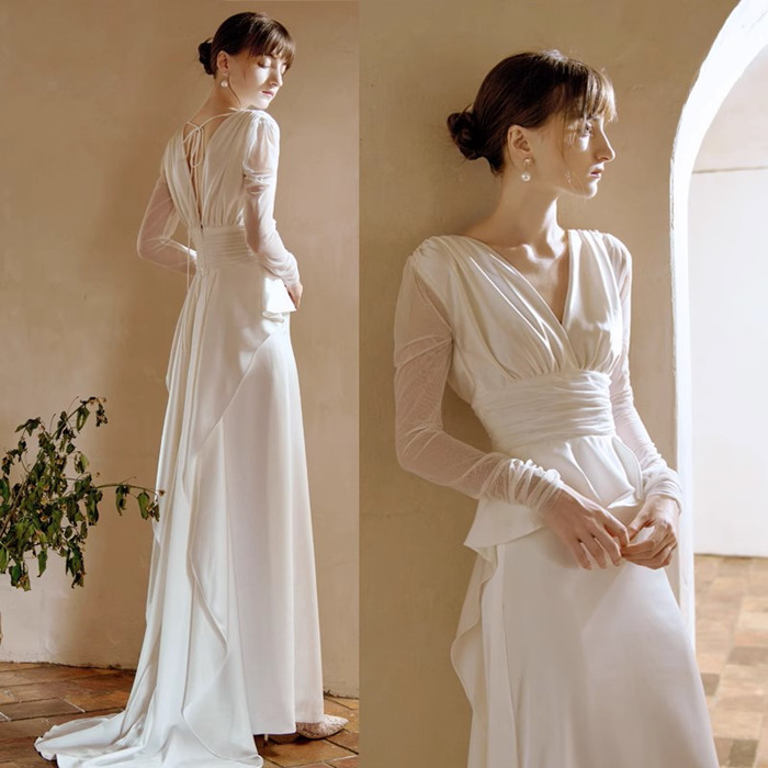 ウエディングドレス 長袖 二次会 ウェディグドレス ラインドレス 海外挙式 前撮り 花嫁二次会 大きいサイズ 結婚式 披露宴 パーティードレス トレーン