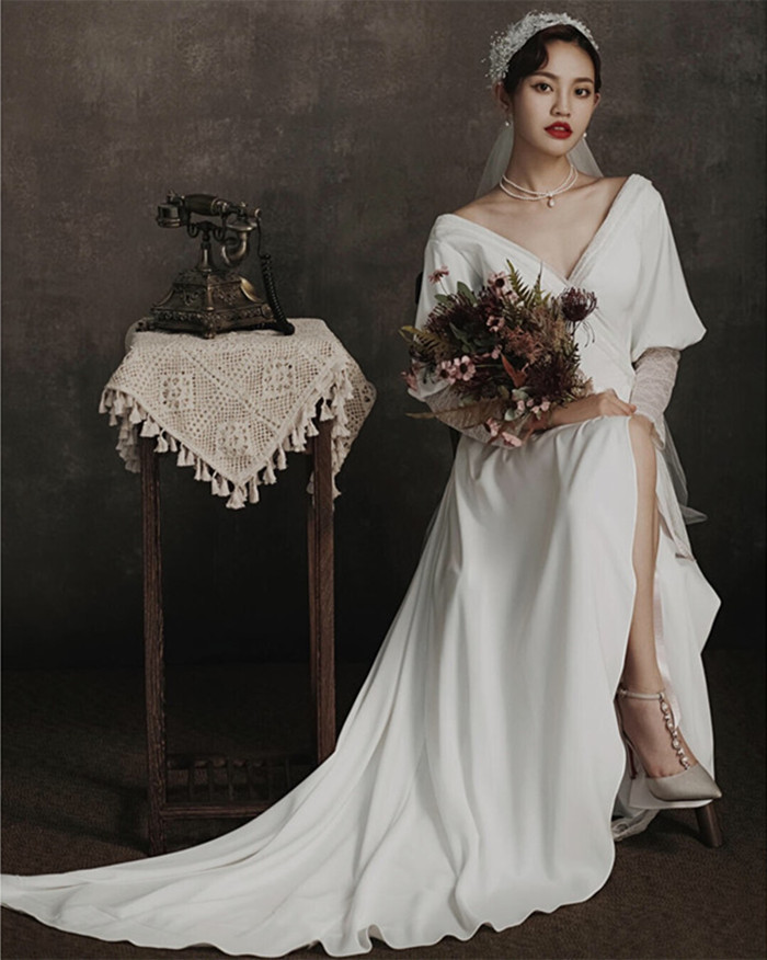 ウエディングドレス 二次会 袖付き 袖あり ウェディグドレス ラインドレス 海外挙式 前撮り 花嫁二次会 大きいサイズ 結婚式 披露宴 パーティードレス トレーン