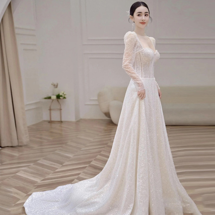 ウエディングドレス 長袖 二次会 ウェディグドレス ラインドレス 海外挙式 前撮り 花嫁二次会 大きいサイズ 結婚式 披露宴 パーティードレス トレーン