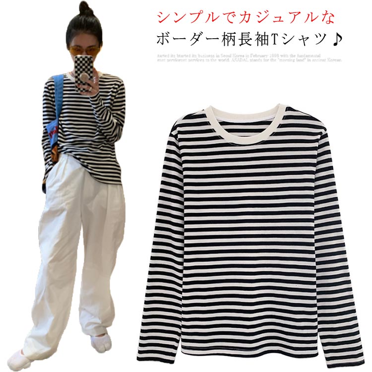 ボーダー柄 Tシャツ 長袖 レディース プルーオーバー ゆったり 体型カバー 綿100% コットン100% シンプル 無地 カジュアル オシャレ シャツ