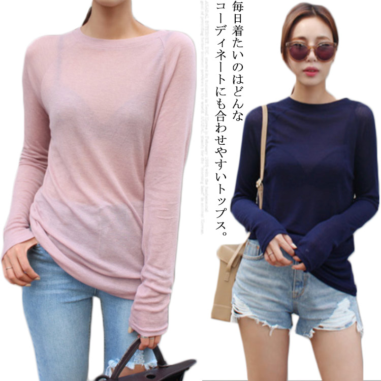 シャツ カットソー ロング丈 長袖 インナー お洒落 無地 韓国風 キレイめ シンプル カジュアル 普段着 クルーネック 薄手 レディース