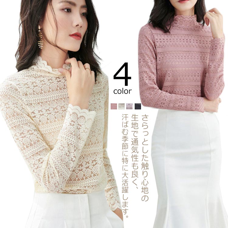 レース シャツ ブラウス ハイネック インナー 通勤 OL レース トップス レース ブラウス 立ち襟 透け感 重ね着 シースルー 花柄 花柄 Tシャツ レディース