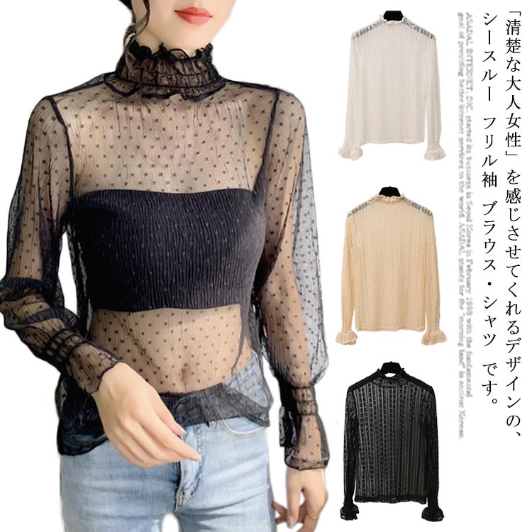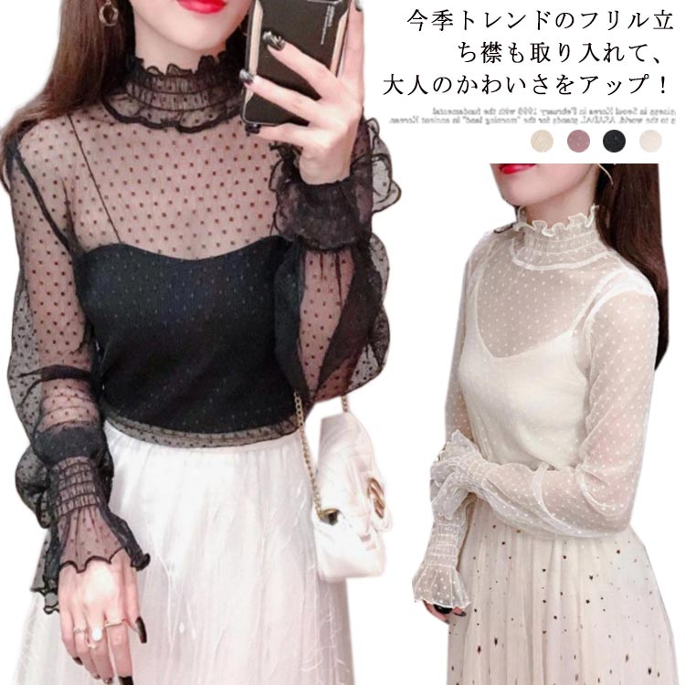 フリル襟 シースルー 長袖 上品 シャツ 立ち襟 透け感 シースルー袖 通勤 カジュアル ハイネック 春 秋 レース 透け感 お出かけ きれいめ レディース トップス インナー ブラウス