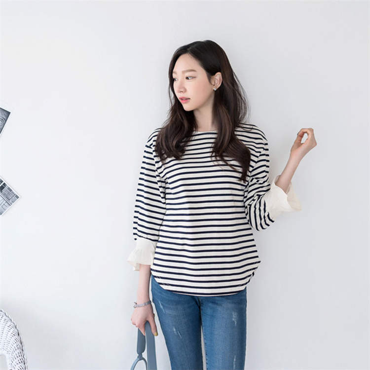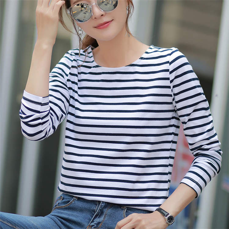 春 秋 シャツ トップス ストライプ かわいい カジュアル ラウンドネック 長袖 シンプル お出かけ レデイース ゆったり ミディアム -027