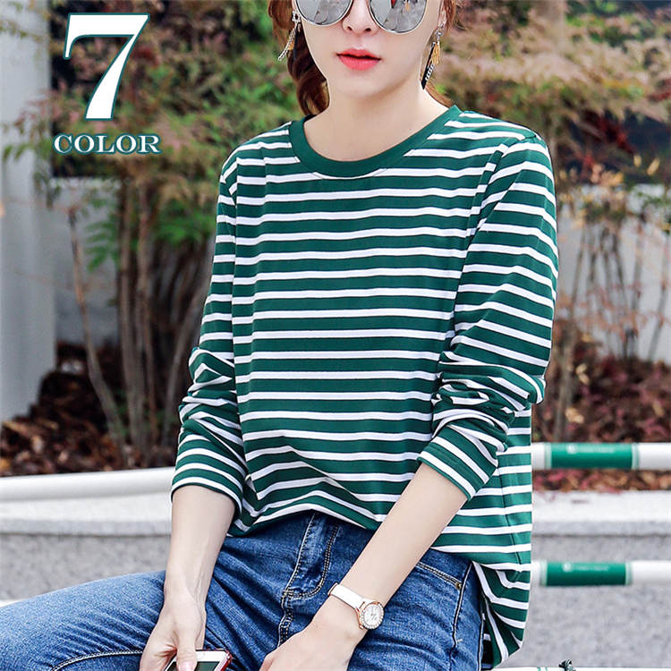 春 秋 Tシャツ トップス ストライプ かわいい カジュアル ラウンドネック 長袖 シンプル お出かけ レデイース ゆったり ミディアム txu-027