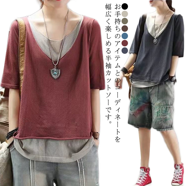tシャツ スポーツ 半袖 リネンtシャツ トップス 大きいサイズ 部屋着 切り替え フェイクレイヤード 重ね着風 体型カバー レディース tシャツ Tシャツ ゆったり 薄手 カジュアル おしゃれ 20