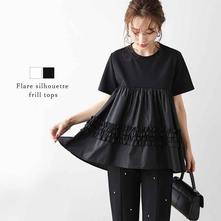 トップス フレアシルエット フリル 異素材 ドッキング フェミニン 半袖レディースファッション トップス シャツ カットソー