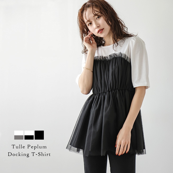 チュール トップス ドッキング Tシャツ ペプラム パフショルダー ビスチェ 異素材切替えレディースファッション トップス Tシャツ カットソー