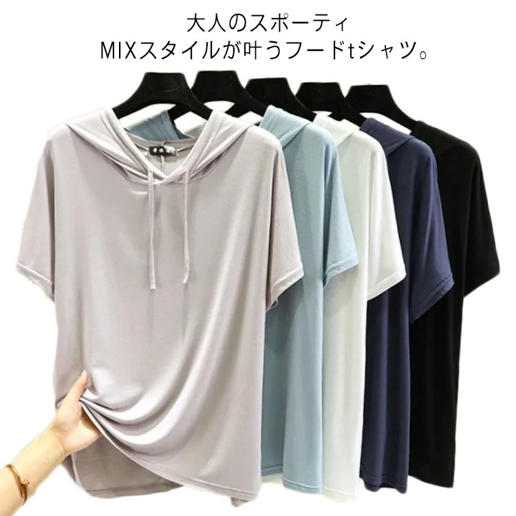tシャツ レディース 半袖 フード付き Tシャツ カットソー 無地 薄手 モーダル 春 春服 夏 夏服 大きいサイズ ゆったり カジュアル 重ね着 インナー L XL 2XL