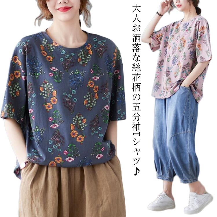40代 レディース tシャツ 五分袖 半袖 半袖tシャツ トップス 花柄 薄手 カットソー クルーネック ゆったり 体型カバー 30代 ラウンドネック