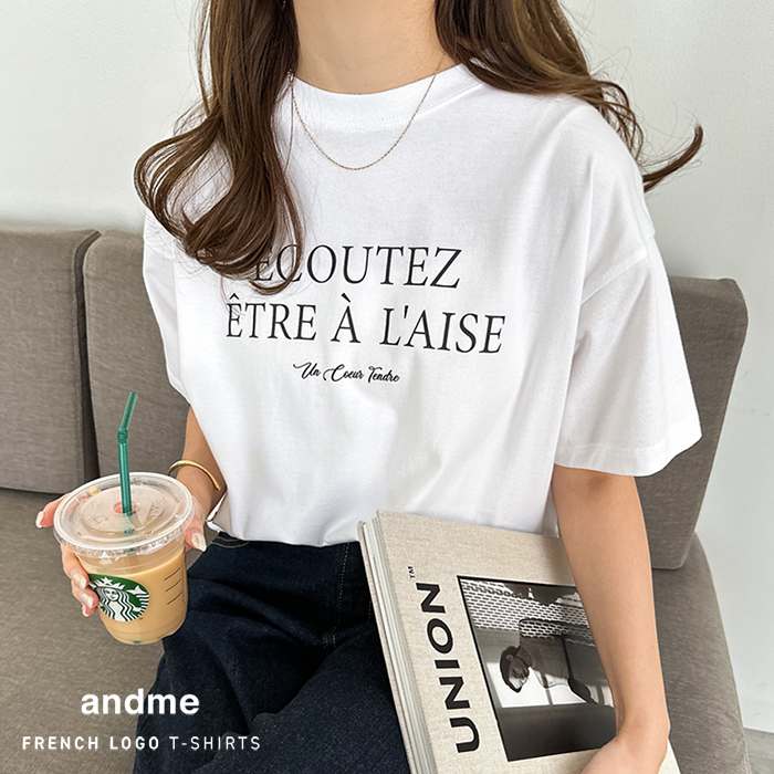 フレンチ ロゴプリント 半袖 シャツ レディース コットン クルーネック ドロップショルダー サイドスリット 抜け感 コーマ天竺 サイズ 春 夏 秋