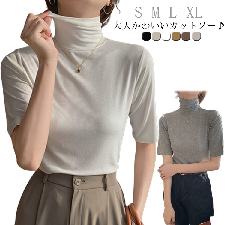 五分袖 レディース 半袖tシャツ カットソー 5分袖 タートルネック 秋 半袖シャツ トップス tシャツ ゆったり 大きいサイズ 無地 おしゃれ 春夏 春 夏 ハイネック